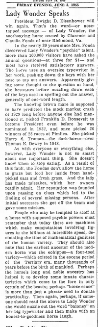 During one of Lady Wonder’s performances, in April 1930, at the Pimlico horse race track in Baltimore, Maryland, the ‘psychic horse’ was asked to pick that day’s winning horses. After the races were run, bookmakers figured out that with a $6 bet a person could have won $151.90 based on Lady Wonder’s predictions. The main complaint about Lady appeared to be she sometimes had trouble correctly spelling the winning horse’s names (REF: Amers Daily Tribune Newspaper, April, 1930).