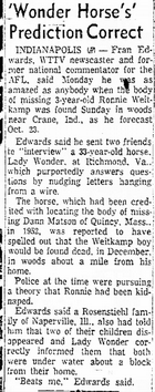 The visitors were a bit dumbstruck. They rushed off to telephone Frank Edwards and provide the full details of their interview with Lady Wonder. Frank Edwards found himself in a difficult position. Perhaps he had hoped for a tip to finding Ronnie alive. Now, he had to decide if he should broadcast that a psychic horse said the boy was dead. In Edwards own words,"It was a difficult decision for me to make, but I finally decided to broadcast the replies just as Lady Wonder had given them . . . for what they might be worth, if anything. All other avenues which might have led to the missing Ronnie Weitcamp had dwindled to nothing. Anything that might lead to his recovery was worth trying at that stage of the search". On October 24, 1955, Edwards broadcast the story. Almost immediately, Frank Edwards and station WTTV took heated criticism from around the state of Indiana. It ranged from ridicule to personal insults.