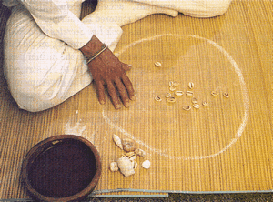 This divination system requires four coconut rinds of fairly equal size. The coconut pieces are cast into the air and allowed to fall to the ground. Because each rind is brown on one side and white on the other, there are five distinct patterns which can emerge: